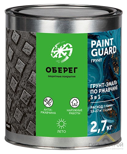 Грунт-эмаль по ржавчине «ОБЕРЕГ PaintGuard» 3в1 - алкидная эмаль для внутренних и наружных работ. Применяется для окрашивания поверхностей эксплуатируемых в атмосферных условиях снаружи и внутри помещений: металлических, как чистых, так и ржавых или частично прокорродировавших с остатками окалины и плотно держащейся ржавчины толщиной до 100 мкм. Отлично ложится на дерево, бетон, асфальт, прочное старое лакокрасочное покрытие.