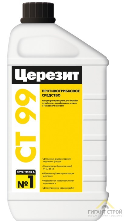 Ceresit CT 99 — противогрибковое средство в виде концентрированного раствора органических биоцидов. Предназначено для уничтожения грибков, плесени, лишайников, мхов и микроорганизмов (водорослей и бактерий) на минеральных поверхностях.